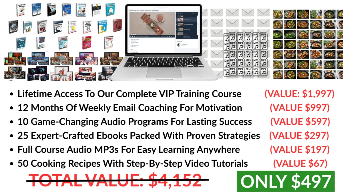 When you join, you’re getting lifetime access to our complete training course, weekly email coaching for ongoing support, powerful audio programs, expert-crafted ebooks, and 50 delicious recipes with step-by-step tutorial videos that also include the nutritional value of each — everything you need to stay on track with your diet and achieve lasting results.